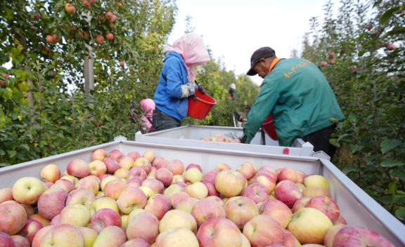Farmers harvest apples at a plantation in Shapotou District of Zhongwei, northwest China's Ningxia Hui Autonomous Region, Oct. 25, 2025.