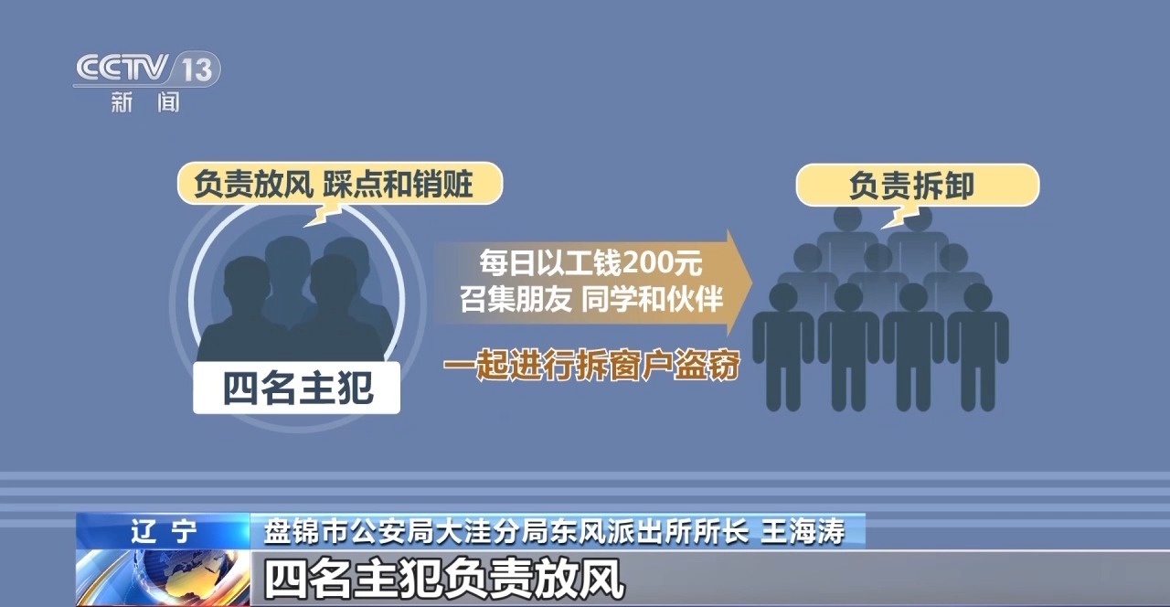 遼寧省盤錦市公安局大洼分局東風(fēng)派出所所長 王海濤:我們發(fā)現(xiàn)這個犯罪團伙有嚴(yán)密的架構(gòu)。有四名主犯作為召集人,然后每日以工錢200元召集他們的朋友、同學(xué)和伙伴一起進行拆窗戶盜竊。這些被召集的人負(fù)責(zé)拆卸,四名主犯負(fù)責(zé)放風(fēng)、踩點和銷贓。