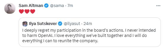 在這封信發(fā)布前不久,蘇茨克沃在X上發(fā)帖稱:“我對參與董事會(huì)的行動(dòng)深表遺憾。我從未想過要傷害OpenAI。我熱愛我們共同建立的一切,我會(huì)盡我所能讓公司重新團(tuán)結(jié)起來。”而阿爾特曼也對此發(fā)聲回應(yīng)了愛心的表情。