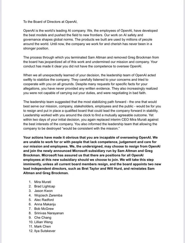董事會(huì)的行動(dòng)顯然表明他們無法監(jiān)督OpenAI。我們無法為或與缺乏能力、判斷力和對我們的使命和員工關(guān)心的人工作。我們簽署者們,可能選擇辭去OpenAl職務(wù),并加入由Sam Altman和Greg Brockman運(yùn)營的新宣布的微軟子公司。