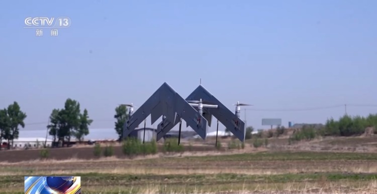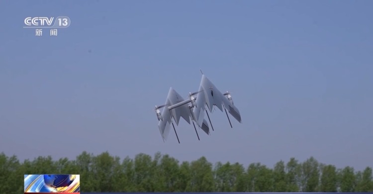 總臺(tái)央視記者 褚爾嘉:現(xiàn)在在我面前這里就是一款全新的無人機(jī)類型,我們可以看到它由兩個(gè)固定的飛翼組成,它也是目前全球首創(chuàng)的一個(gè)雙飛翼垂直起降固定翼無人機(jī)。這款無人機(jī)它是可以實(shí)現(xiàn)豎直狀態(tài)下的一個(gè)垂直起降,起飛后,它又可以實(shí)現(xiàn)一個(gè)正常的平飛。