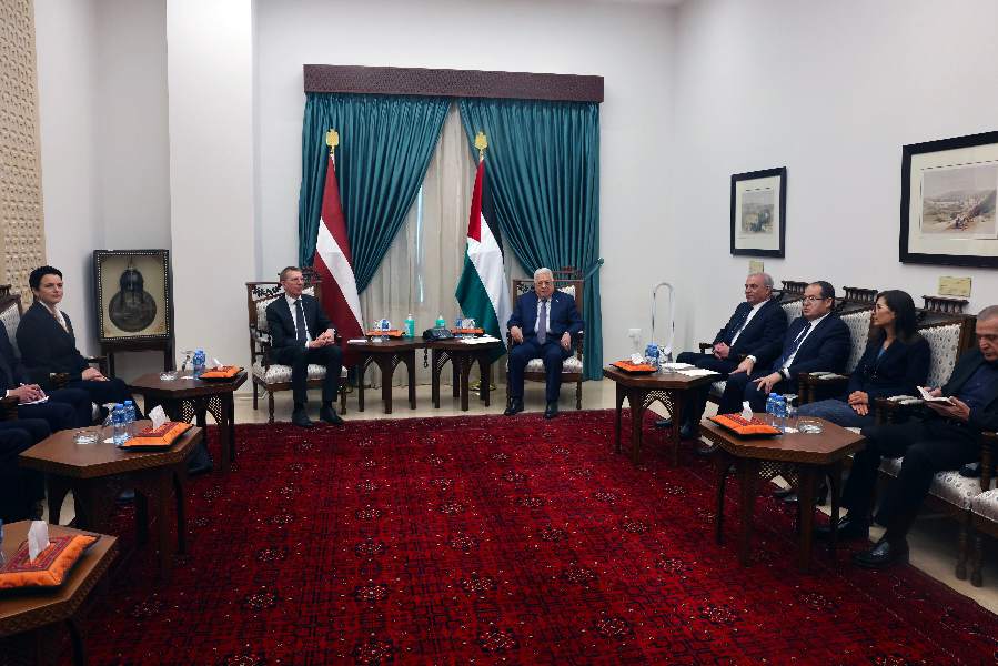 當地時間20日,巴勒斯坦總統阿巴斯在位于約旦河西岸城市拉姆安拉的總統府會見拉脫維亞總統林克維奇斯。