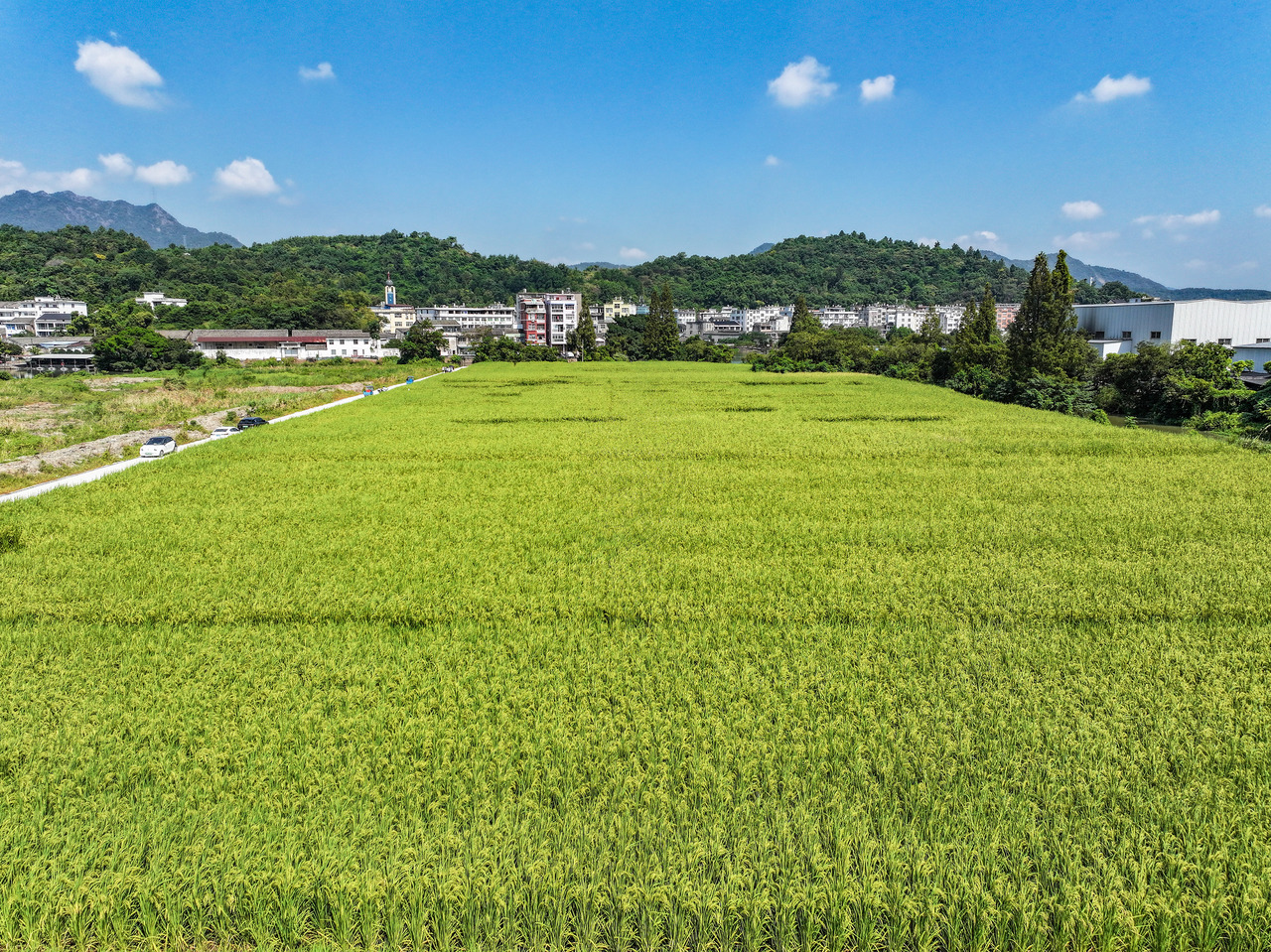 站在田埂上眺望,粗壯稻稈直直挺立,微風拂過,層層稻浪翻滾。