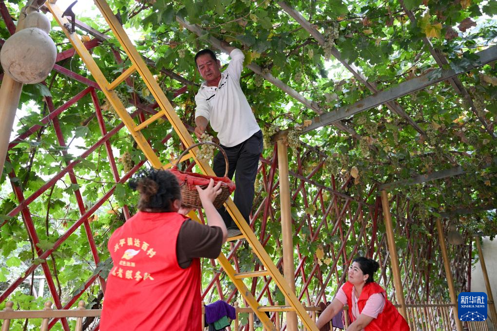 9月18日,達西村村干部入戶幫助村民采摘葡萄。近年來,達西村充分挖掘房前屋后閑置土地及荒廢地塊,逐步擴大特色林果種植面積,引導村民增收。新華社記者 辛悅衛 攝pagebreak