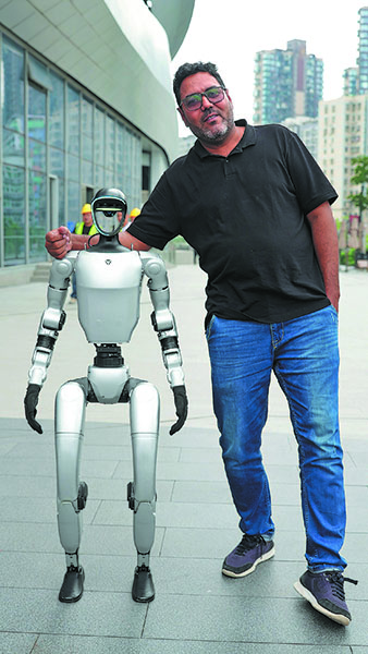 A participant of the 2025 Training Program for Arab Officials and Scholars in Culture and Tourism poses for a photo with a robot in Shenzhen, Guangdong province, in mid-September. [Photo provided to China Daily]
