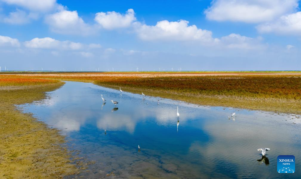 An aerial drone photo taken on Oct. 11, 2025 shows the scenery of a wetland in Dongtai, east China's Jiangsu Province. (Photo by Sun Jialu/Xinhua)