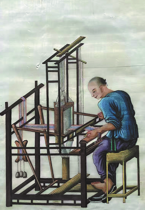 A man weaving silk on a loom is captured in a Tongcao painting. CHINA DAILY