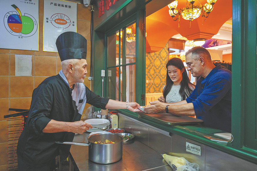 Saulebek Kabylbekov (left) serves Kazakh dishes he cooked to colleagues at the canteen of Daqing Ophthalmology Hospital in Daqing city, Northeast China's Heilongjiang province, July 16, 2025. ZHANG TAO/XINHUA