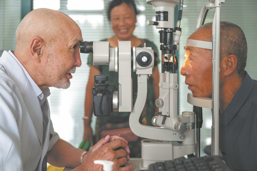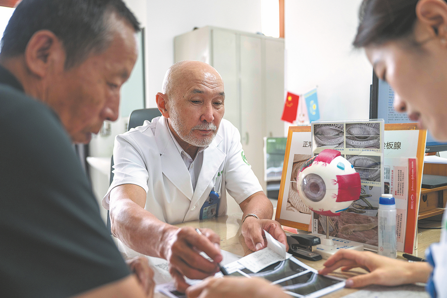 Saulebek Kabylbekov (left) examines the eyes of a patient at Daqing Ophthalmology Hospital in Daqing city, Northeast China's Heilongjiang province, July 16, 2025. ZHANG TAO/XINHUA