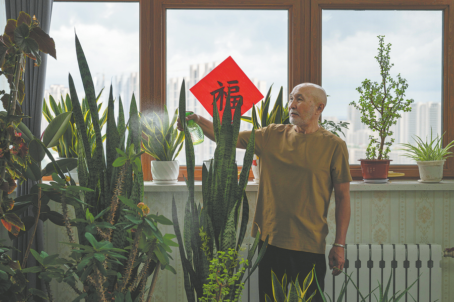 Saulebek Kabylbekov waters green plants at his apartment in Daqing city, Northeast China's Heilongjiang province, July 16, 2025. ZHANG TAO/XINHUA