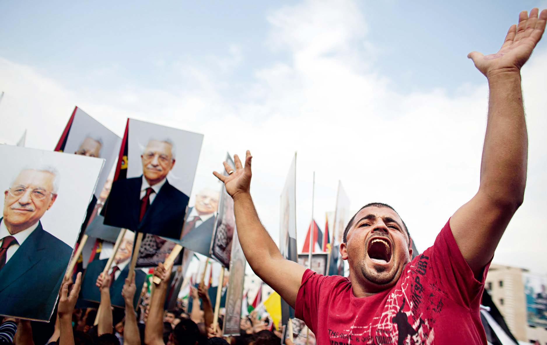當地時間2011年9月25日,阿巴斯在約旦河西岸城市拉姆安拉發表演說,支持者為其歡呼。此前,他向聯合國遞交了巴勒斯坦入聯申請文件。(視覺中國)
