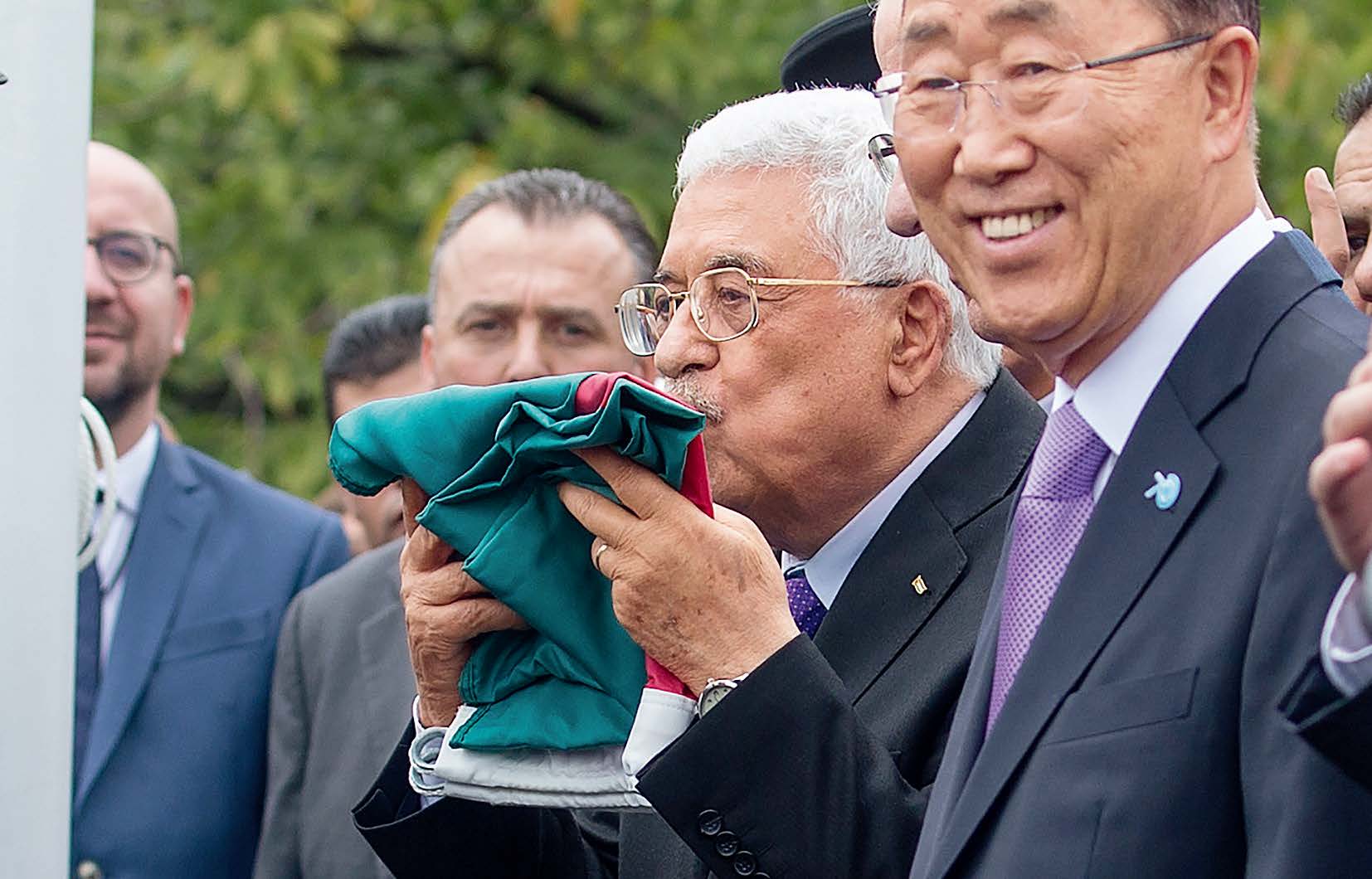 2015年9月最后一天的下午,紐約聯合國總部第一次升起了巴勒斯坦國旗。阿巴斯深情親吻巴勒斯坦國旗,然后將它交給3名聯合國儀仗隊隊員,注視著旗幟緩緩升起。時任聯合國秘書長潘基文說:“希望升起的巴勒斯坦國旗給巴勒斯坦人民和國際社會帶去希望:巴勒斯坦建國是可以實現的。”