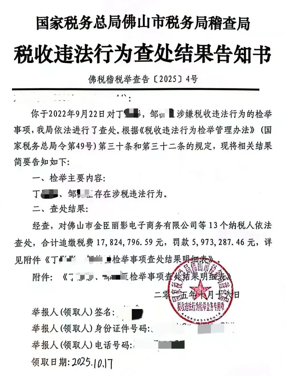 此后,記者聯系佛山市稅務局稽查局,對于小影夫婦補稅情況,工作人員表示不便受訪。佛稅稽稅舉查告[2025]4號稅收違法行為查處結果告知書顯示:對丁某某、鄒某某(即小影夫婦)涉嫌稅收違法行為的檢舉事項,我局依法進行了查處。經查,兩人存在涉稅違法行為,對佛山市金臣麗影電子商務有限公司等13個納稅人依法查處,合計追繳稅費17824796.59元,罰款5973287.46元。