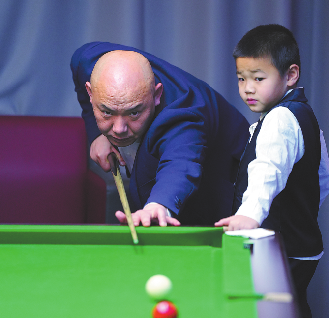 Li Jianbing, coach of Wu Yiren, demonstrates snooker techniques to his young student in Jiaxing city, East China's Zhejiang province, on April 26, 2025. CHEN FAN/FOR CHINA DAILY