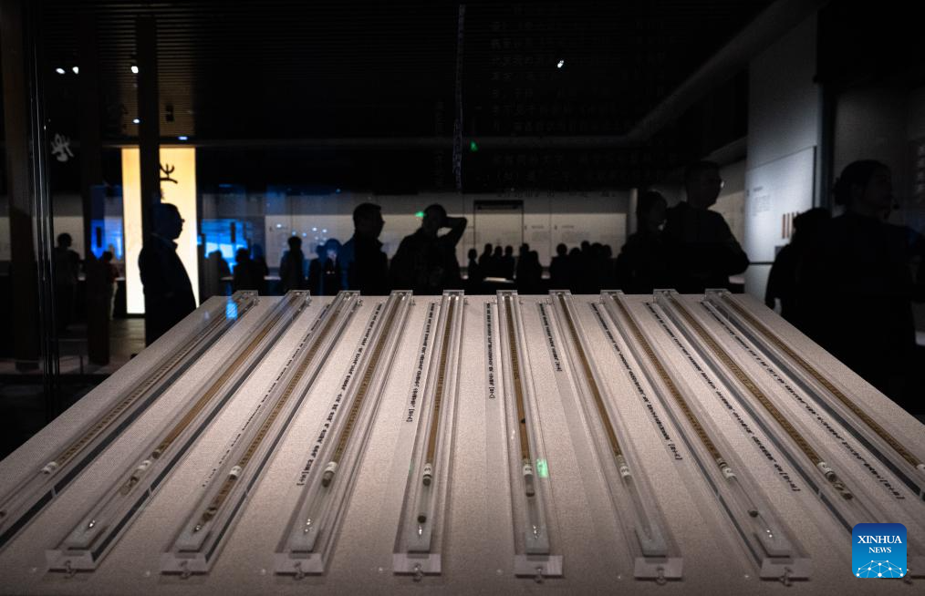 This photo taken on Oct. 28, 2025 shows the exhibition "Ancient Chinese Bamboo and Wooden Slips" at the Hubei Provincial Museum in Wuhan, central China's Hubei Province.