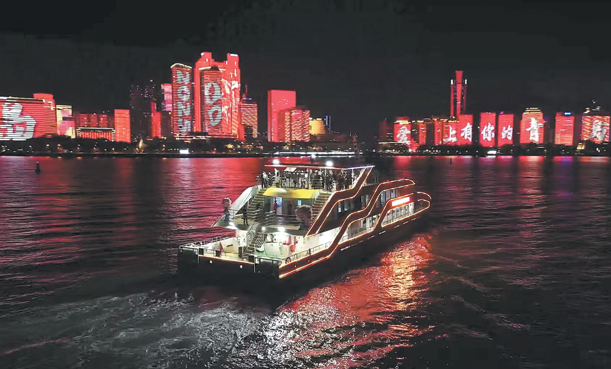 Delegates of the 66th APEC Tourism Working Group Meeting take a boat tour to enjoy Qingdao's night scenery on Oct 14. CHINA DAILY