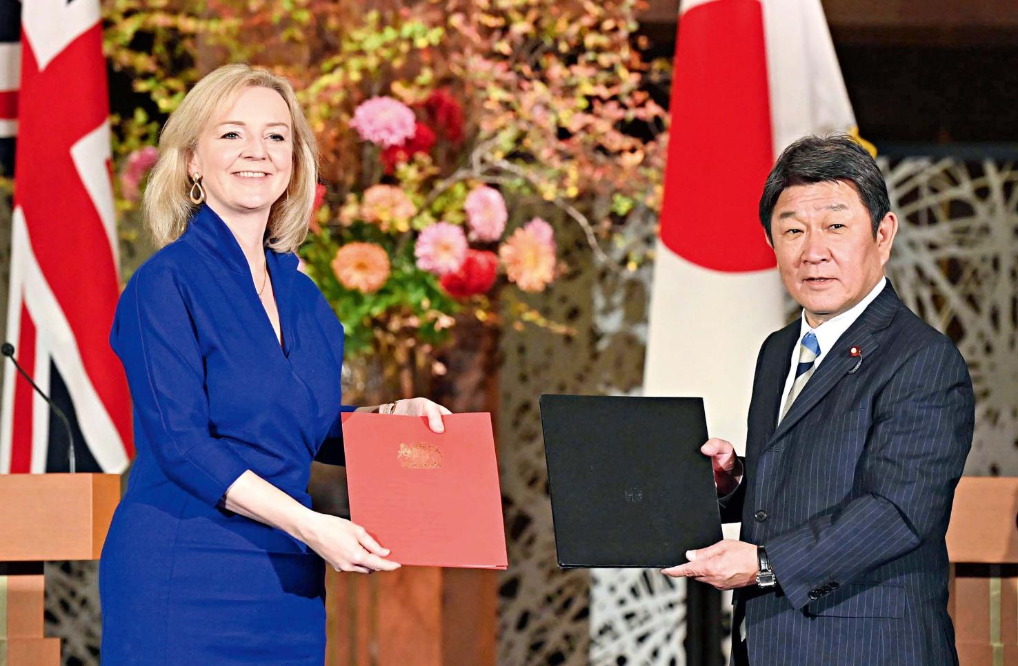 當(dāng)?shù)貢r間2020年10月23日,日本和英國簽署日英全面經(jīng)濟伙伴關(guān)系協(xié)定。圖為時任英國國際貿(mào)易大臣特拉斯和時任日本外務(wù)大臣茂木敏充(右)。(視覺中國)