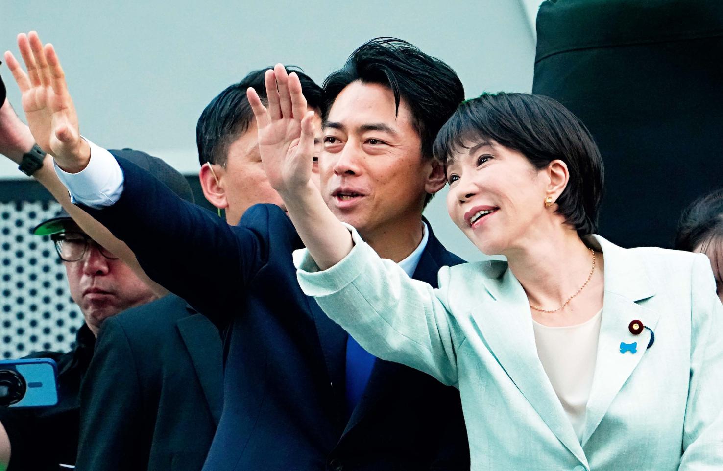 當(dāng)?shù)貢r間2025年9月24日,日本東京,小泉進次郎(右二)和高市早苗(右一)參加自民黨總裁競選活動。(IC Photo)