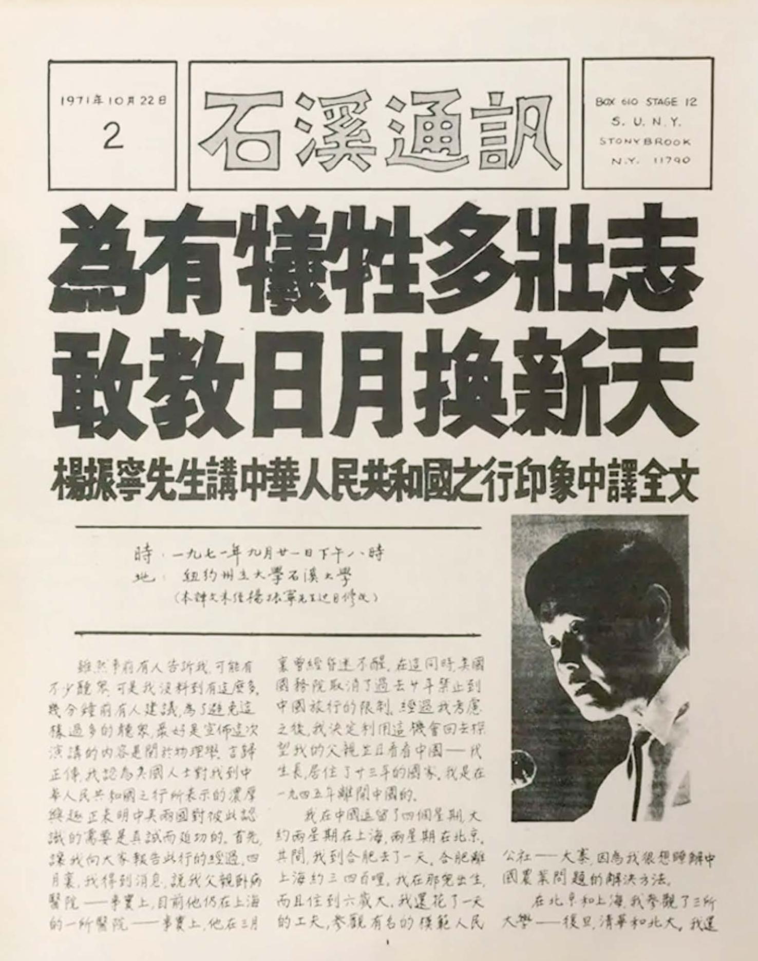 楊先生在清華大學高等研究中心辦公室的墻上有一張裱起來的報紙,記錄了他在1971年回中國訪問后,在紐約州立大學石溪分校發表的中國見聞演講。報紙上寫著“為有犧牲多壯志,敢教日月換新天”。楊先生特別珍視它。