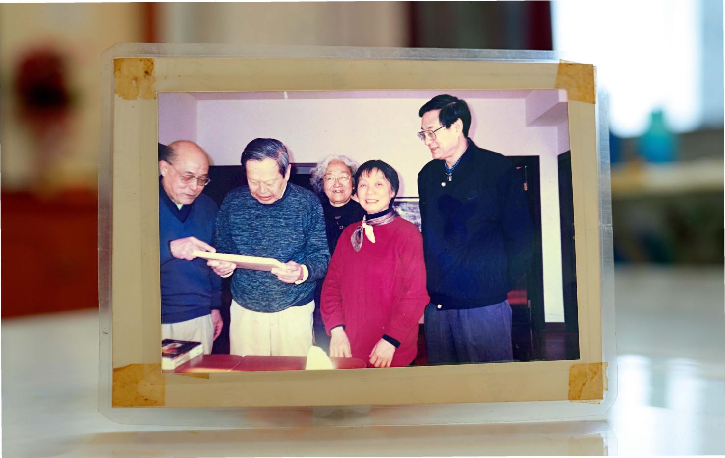 楊建鄴家中的照片。這是2004年2月,楊振寧和楊建鄴一行在清華大學“歸根居”討論書稿。從左至右分別是:楊建鄴、楊振寧、葛墨林妻子秦世芬、楊建鄴妻子吳秋芝、葛墨林。(本刊記者 楊皓/攝)