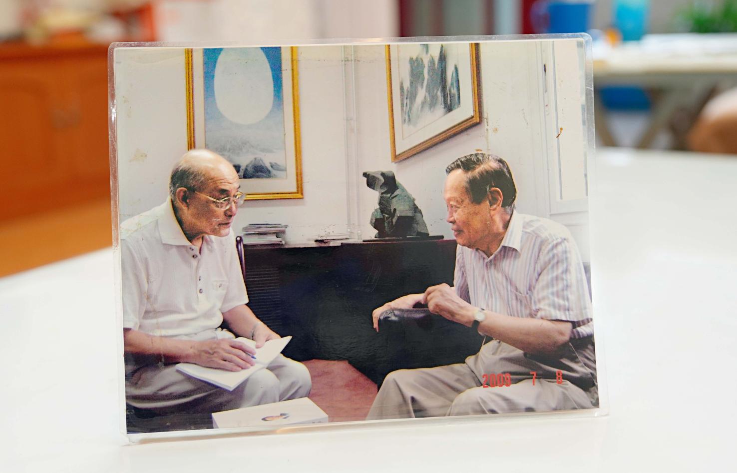 楊建鄴家中的照片。這是2009年7月8日,楊建鄴(左)與楊振寧在清華大學科學館辦公室討論書稿。(本刊記者 楊皓/攝)