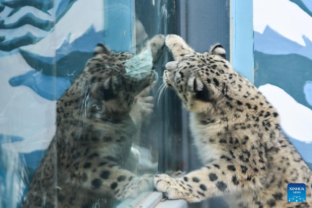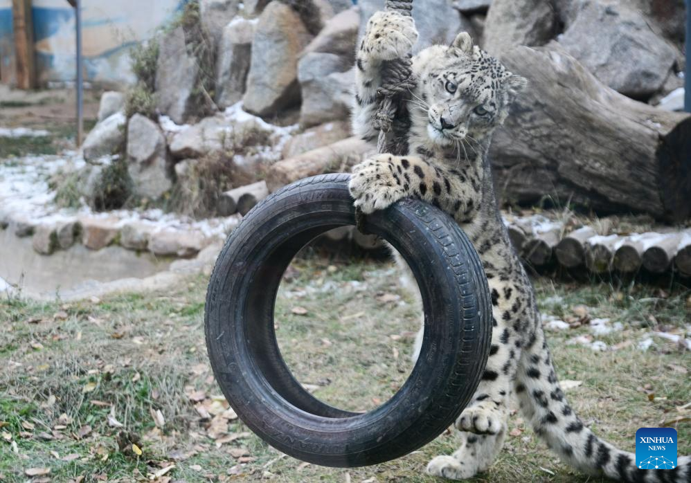 Snow leopard cub Ling Xiaomang is pictured at Xining Wildlife Park in northwest China's Qinghai Province, Nov. 22, 2025. Xining Wildlife Park is a zoo-like facility also responsible for rescuing, treating and rehabilitating wild animals from across the province. Ling Xiaomang, a snow leopard cub rescued this year, is gradually regaining mobility. (Xinhua/Qi Zhiyue)