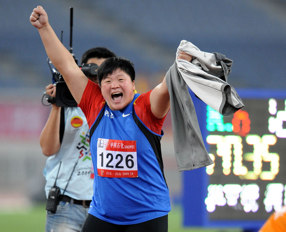 2009年10月21日,在第十一屆全運會女子鉛球決賽中,鞏立姣慶祝勝利。新華社記者 李尕 攝