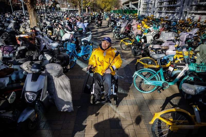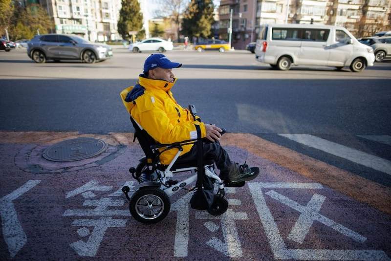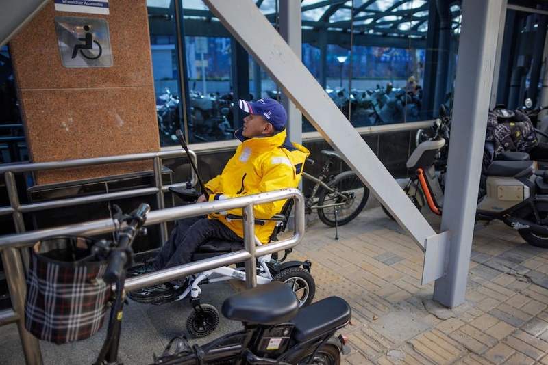 12月1日,張屹依靠電動輪椅出行。