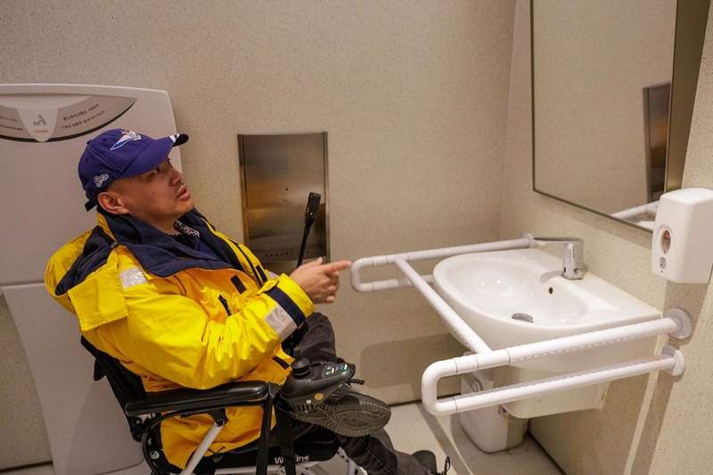 12月1日,張屹體驗了通州萬象匯頂層電影院的無障礙廁所,該廁所并未設置有設計規范要求的多功能臺和低位掛衣鉤,這會給殘障人士解決生理問題時帶來困難。