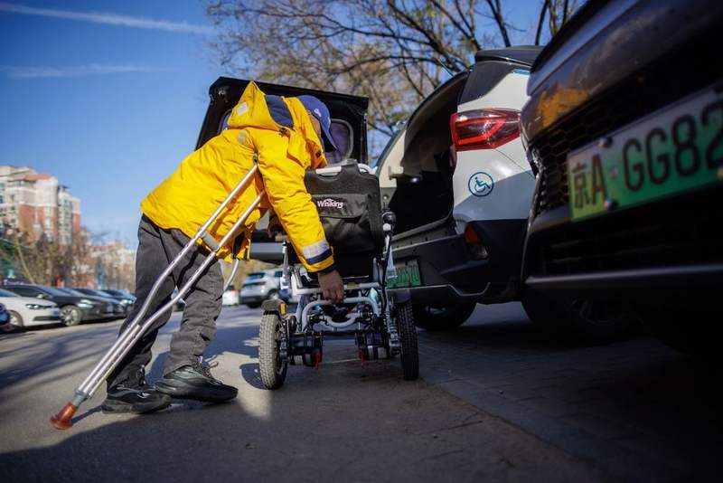 12月1日,張屹將電動輪椅放進車的后備廂準備出發,車輛后部張貼了無障礙標識。