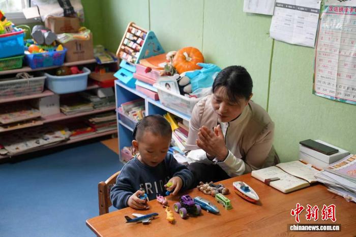 中新網(wǎng)南昌12月3日電 “旦旦(化名),拿上寶寶的本子跟老師去上課好不好呀?我們上樓啦,看看樓梯上有什么呀,有小腳丫對(duì)不對(duì),我們來數(shù)數(shù),一二三……”一個(gè)平常的工作日,在江西鷹潭市特殊需要兒童康復(fù)中心,曹有紅帶著3歲的聽障男孩旦旦上個(gè)訓(xùn)課。比起三尺講臺(tái)上的“老師”,今年50歲的曹有紅更像“媽媽”,讓愛的陽光穿透一絲絲縫隙照亮孩子們封閉的小世界。