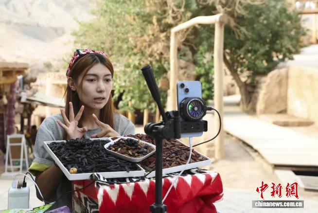 2025年9月9日,新疆鄯善縣吐峪溝景區商戶在直播賣貨。中新社記者 王紫儒 攝